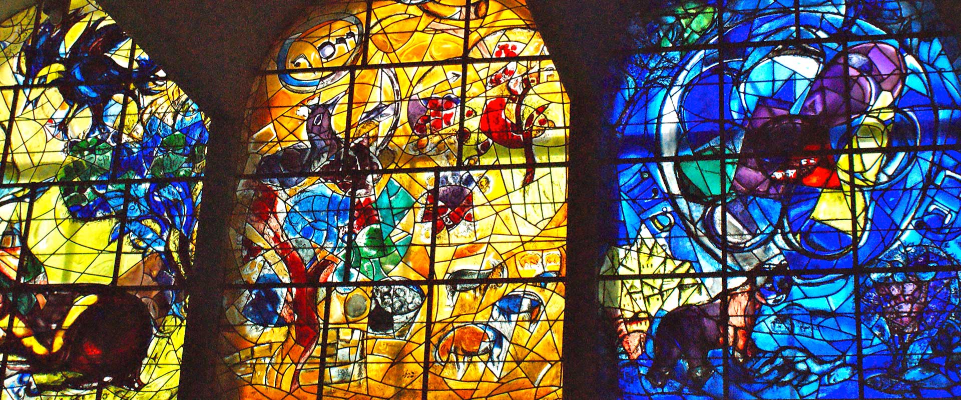 Every pane is a microcosm of Chagall’s world, real and imaginary; of his love for his people, his deep sense of identification with Jewish history, his early life in the Russian shtetl.